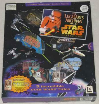 The box also includes demos of Full Throttle, Star Wars: Dark Forces (not present in Mac version) and three playable levels of Star Wars: Rebel Assault, along with a Star Wars Screen Entertainment and a LucasArts SuperSampler disc
